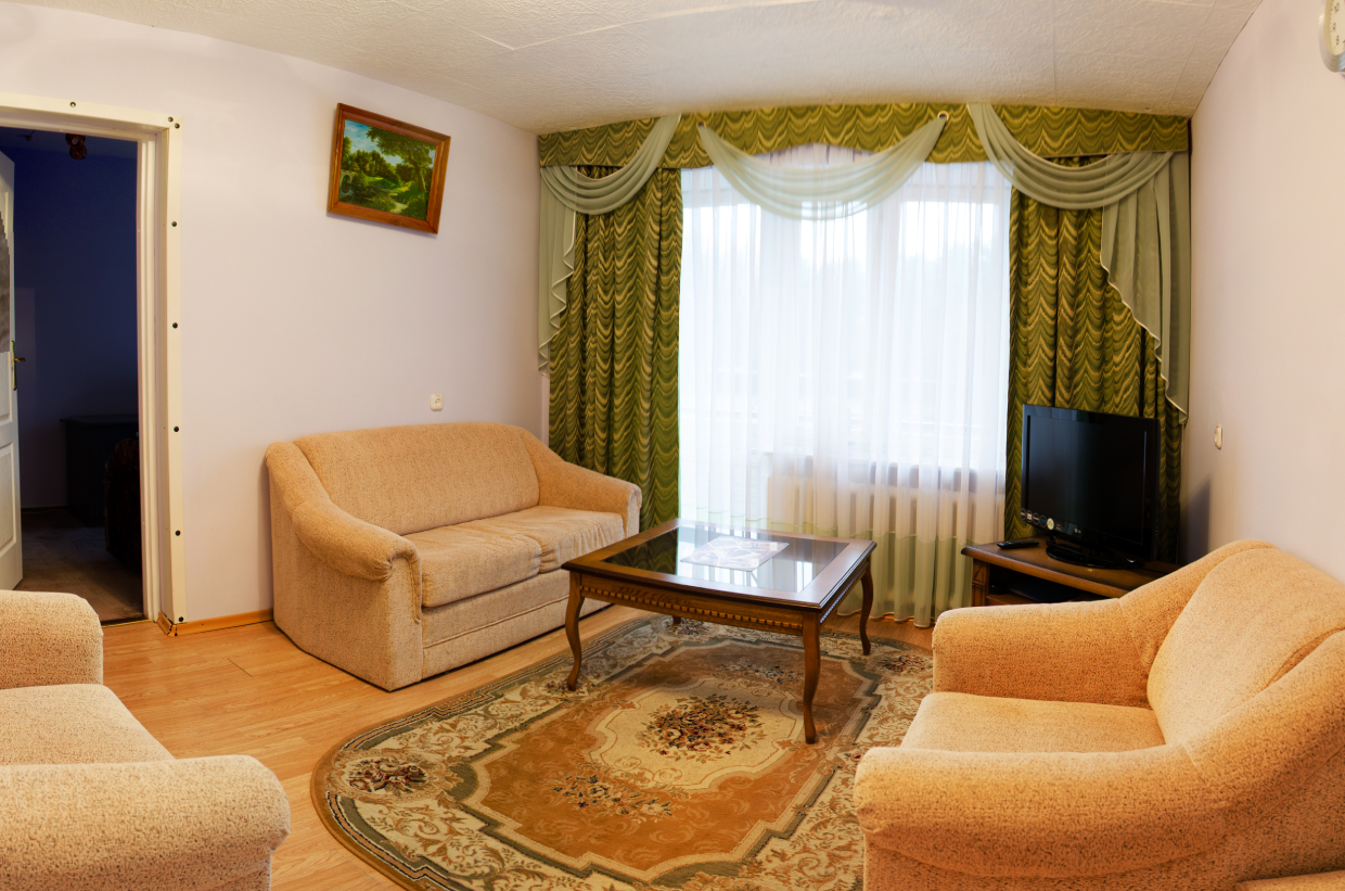 3 осн. места. 1 доп. место. Мебель: вешалка, диван, зеркало, кресла, кровать двуспальная, прикроватные тумбочки, столик журнальный, тахта (2), тумба, шкаф. Оборудование: гладильная доска, сушилка для белья, телевизор, холодильник, электрочайник. Санузел: с душевой кабиной, туалетные принадлежности. Сервис: смена полотенец, смена постельного белья, уборка номера.